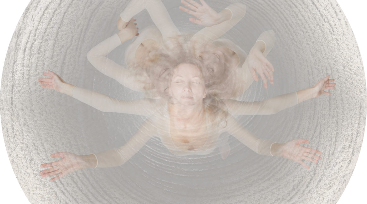 Ein rundes, fotografisches Objekt liegt flach auf dem Boden, die Betrachtenden können es umschreiten, jedoch lenkt die Bildkomposition den Blick: Es zeigt eine schwebende Frau in mehrfach überlagerten, kreisenden Bewegungen, eingefügt in konzentrische Kreise, die räumliche Tiefe andeuten. Die Frau wirkt durchscheinend, mit geschlossenen Augen, fast wie ein ätherisches Wesen....